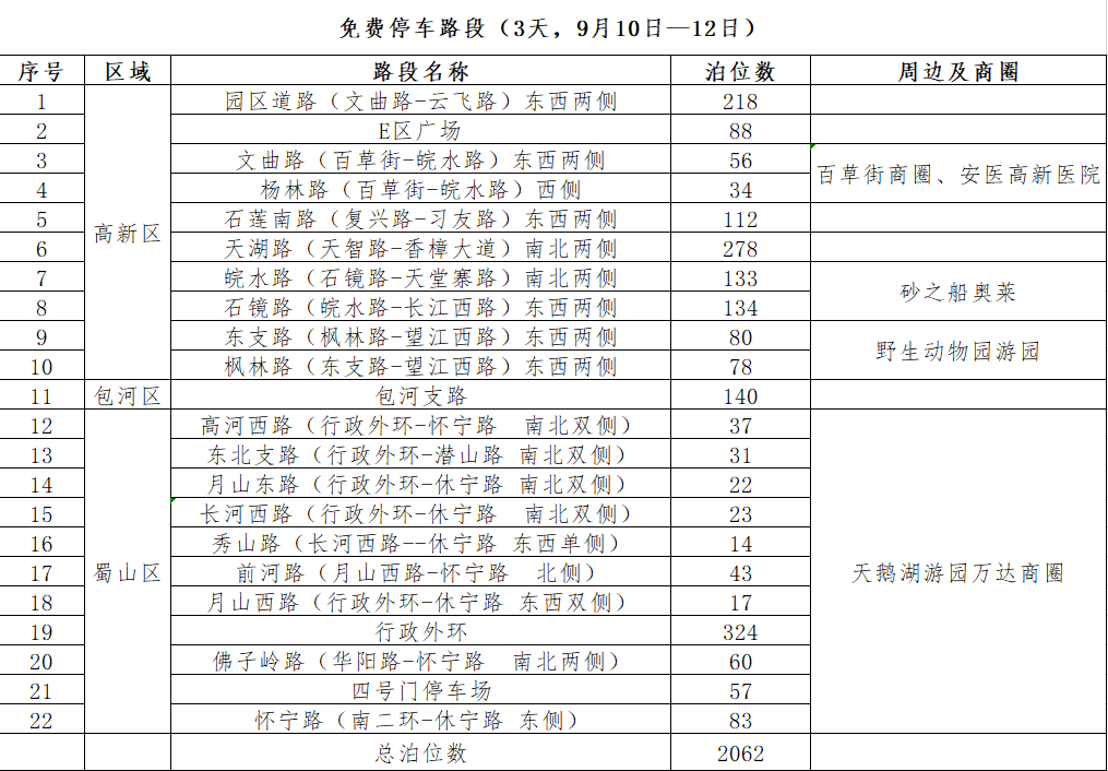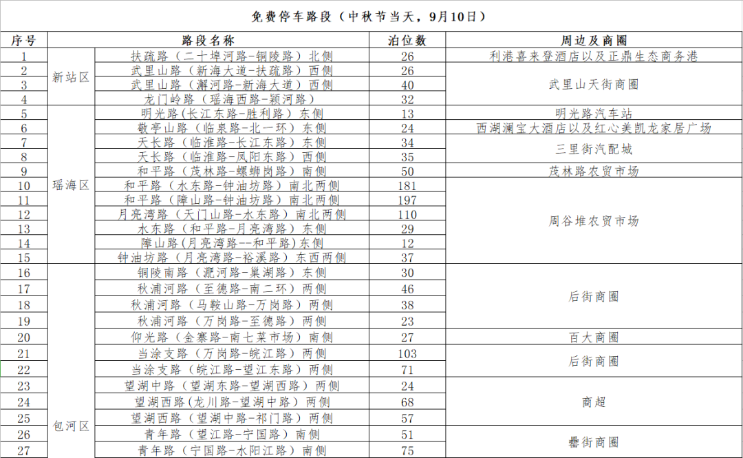 为响应合肥市“就地过节”倡议,使广大市民中秋节期间停车更舒心,让群众在天天有感的关键小事上有获得感,合肥市公安局交警支队联合合肥城泊推出“迎中秋、暖民心”便民停车服务举措。为更好满足市民办事期间的临时停车需求,合肥城泊管理的路内停车泊位实行30分钟免费停车,夜间免费停车惠民政策。中秋节假期,为方便市民前往商圈、公园周边购物、游玩,合肥城泊对城区部分路边泊位及停车场,根据停车环境区域特征免费对市民开放。现将中秋期间免费开放的路段及停车场公布如下:
