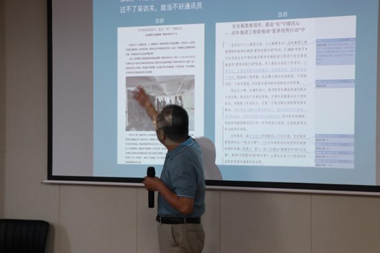 邢志鸿老师就新闻写作基本常识和写作技巧等内容进行授课,他结合自身工作经历和体会,穿插典型案例,采用”理论+分析+点评”的方式,引导大家进一步了解新闻稿撰写的基本要领。