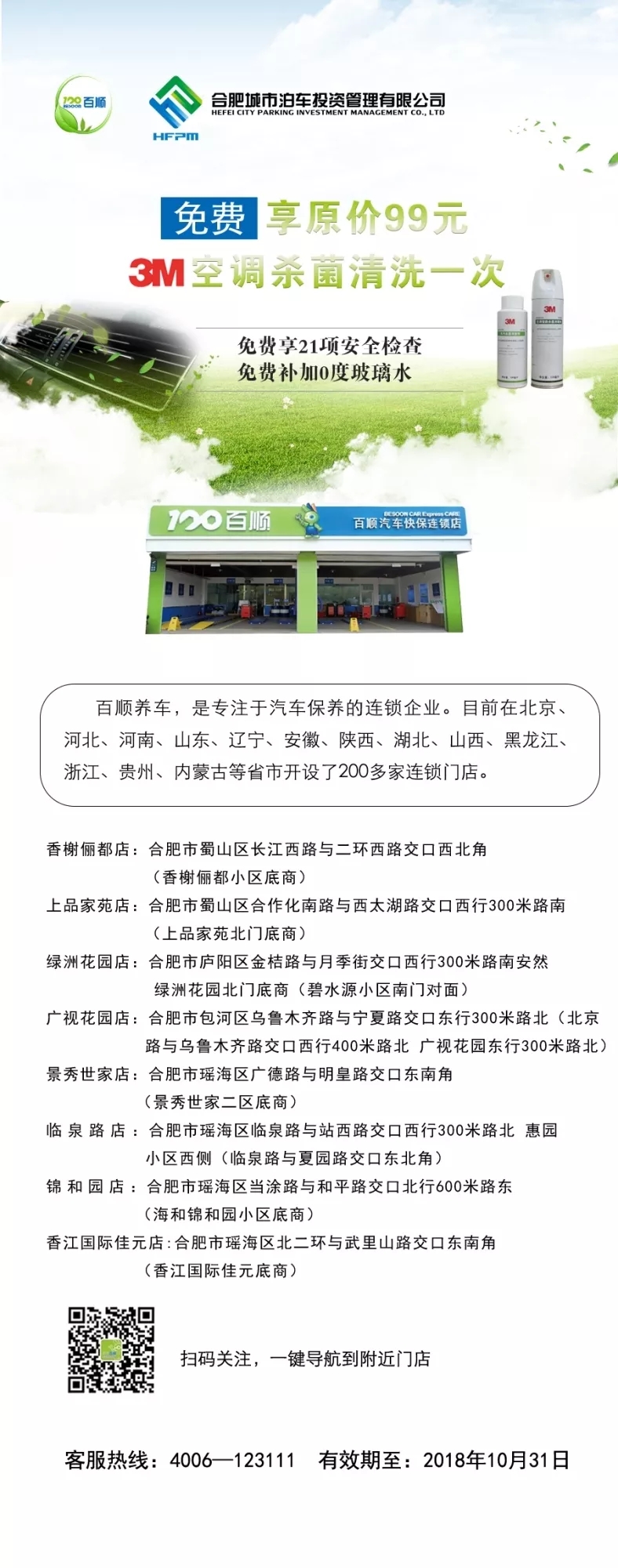 活动期间,“合肥停车”APP用户凭缴费记录即可在合肥百顺汽车服务公司任意门店享受以上活动,每个ID仅可享受一次福利。1万个名额!!!先到先得,享完即止。