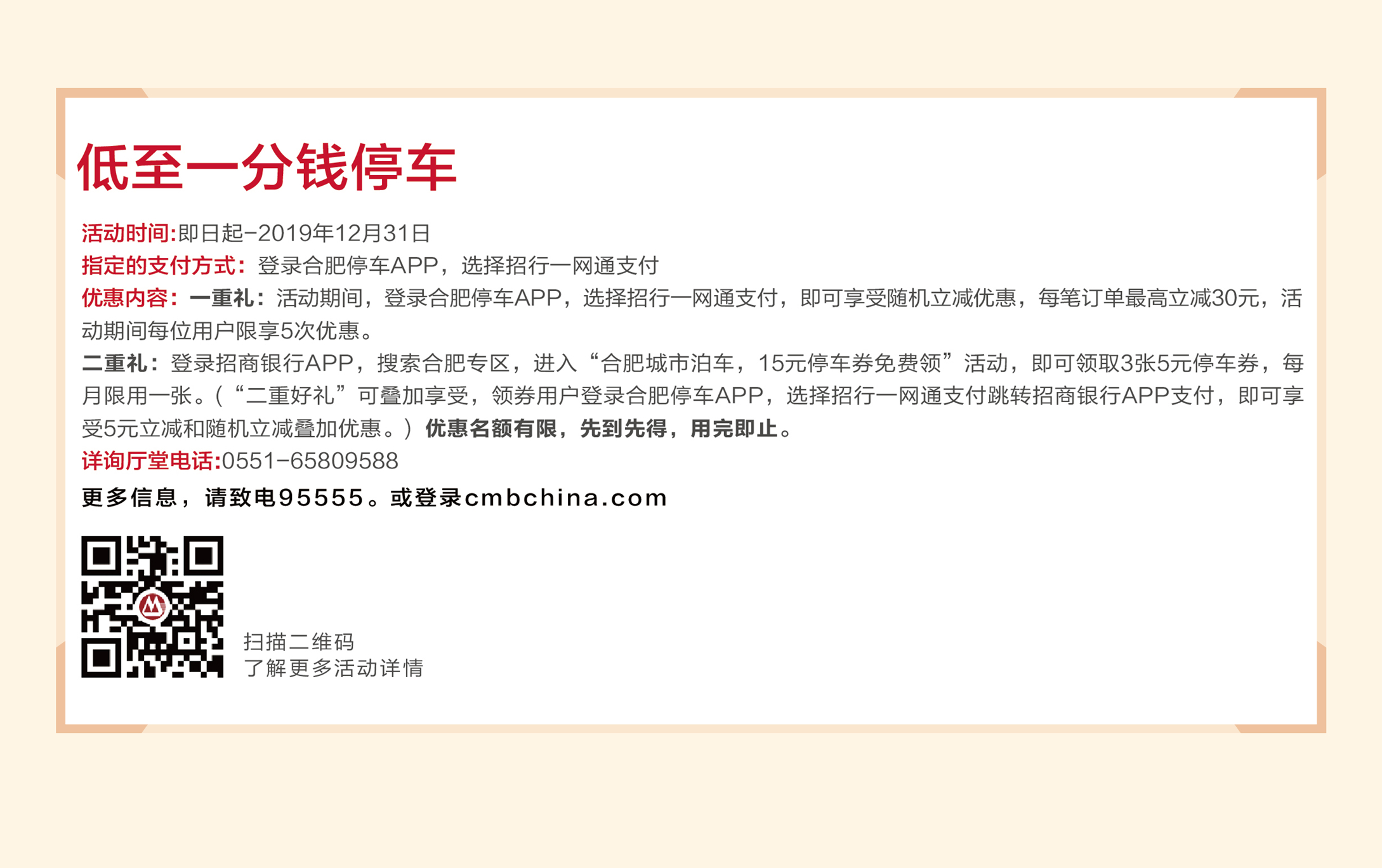 即日起-2019年12月31日,登录合肥停车APP,选择招行一网通支付,随机立减+15元停车券免费领,“双重好礼”相送,停车低至一分钱!5元以下支付一分钱,5元以上最高可减35元!