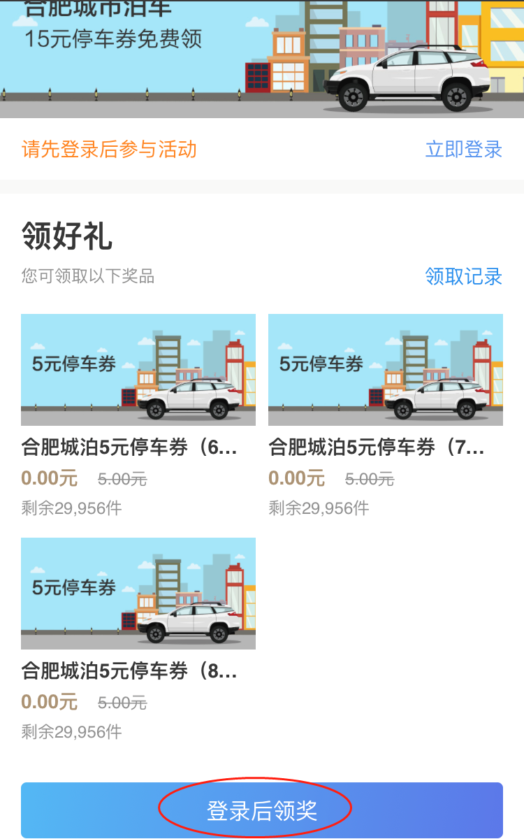 进入“合肥城市泊车,15元停车券免费领”活动,领取3张5元停车券。(每月限用一张)