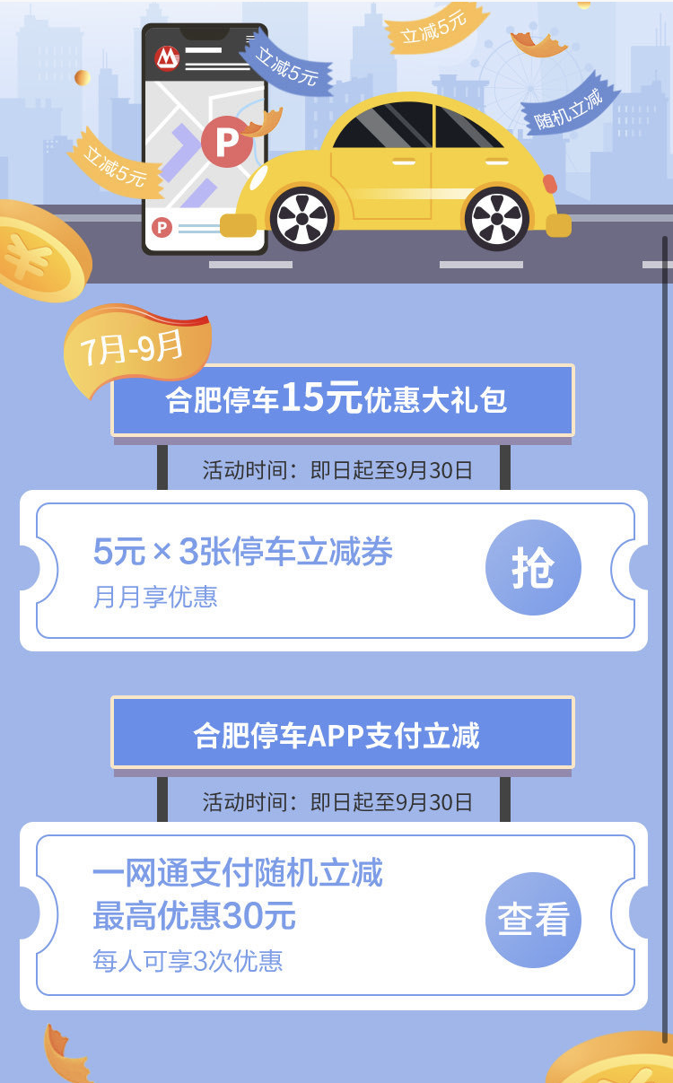 活动期间,登录“合肥停车”APP,选择“招行一网通”支付,即可享受随机立减1—30元优惠!活动期间每位用户限享3次优惠。