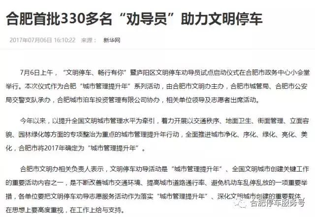 同时,在全市范围内推行文明停车劝导员的城市管理辅助服务,实现停车规范有序,营造文明和谐的动静态交通环境,助力合肥市城市管理水平提升。作为合肥市“城市管理提升年”系列活动之一,本次活动旨在打造文明、和谐、有序、畅通的城市交通环境,提高城市品位和形象,推进“智慧合肥”建设,推动城市管理创新,引领市民智慧出行。进一步强化全市交通综合治理,提升城市品质,打造城市品牌,助推城市精细化管理水平再上新台阶!