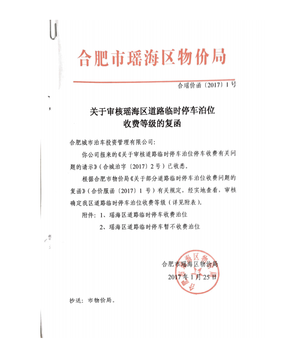 关于审核瑶海区道路临时停车泊位收费等级的复函 合瑶价函[2017]1号