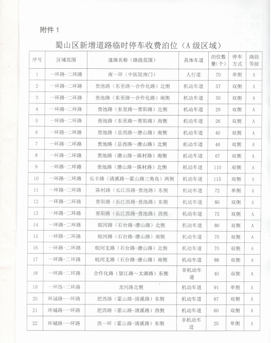 关于审核蜀山区新增道路临时停车泊位收费等级的复函 合蜀价函[2017]5号