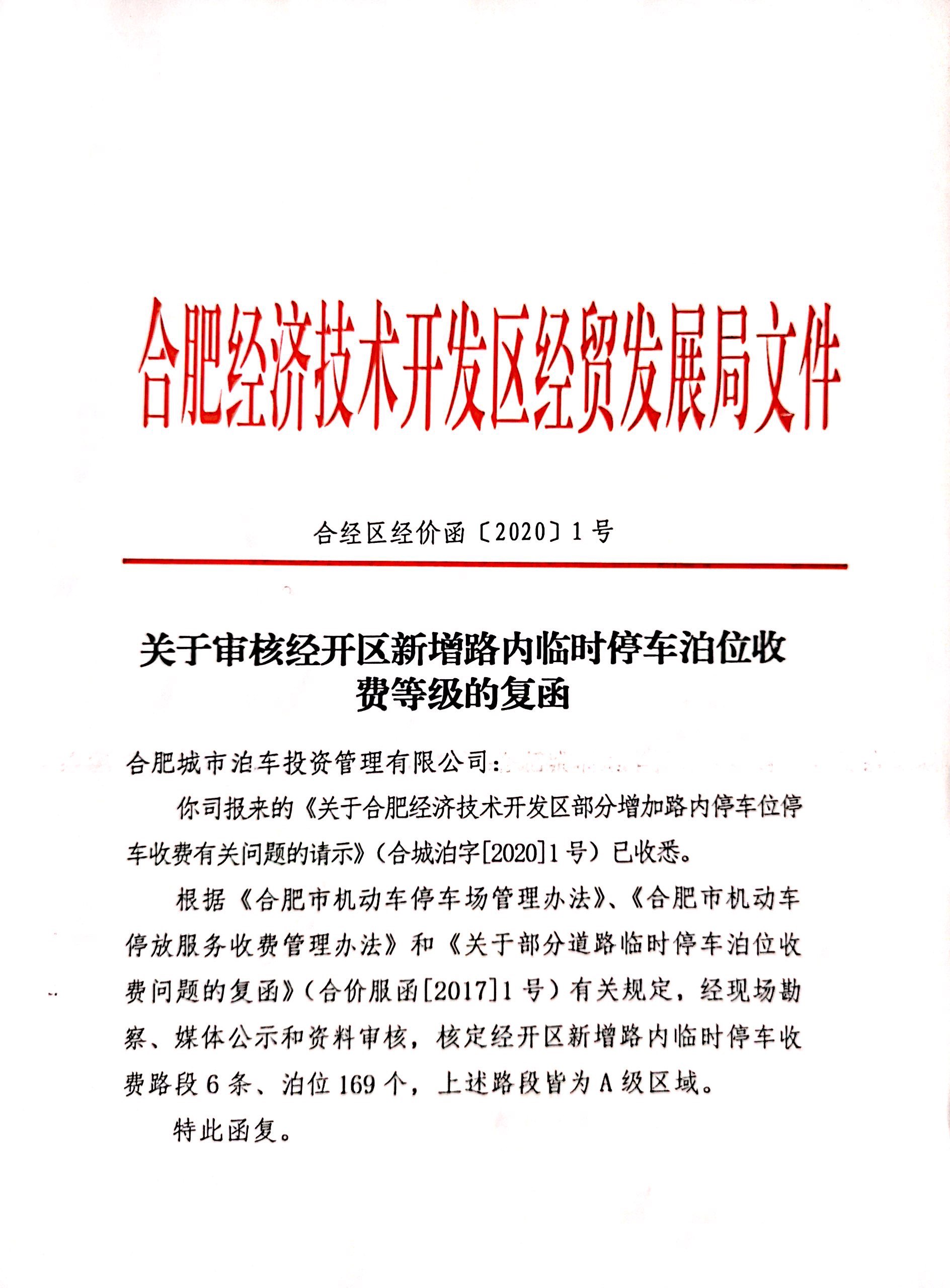 关于审核经开区新增路内临时停车泊位收费等级的复函
