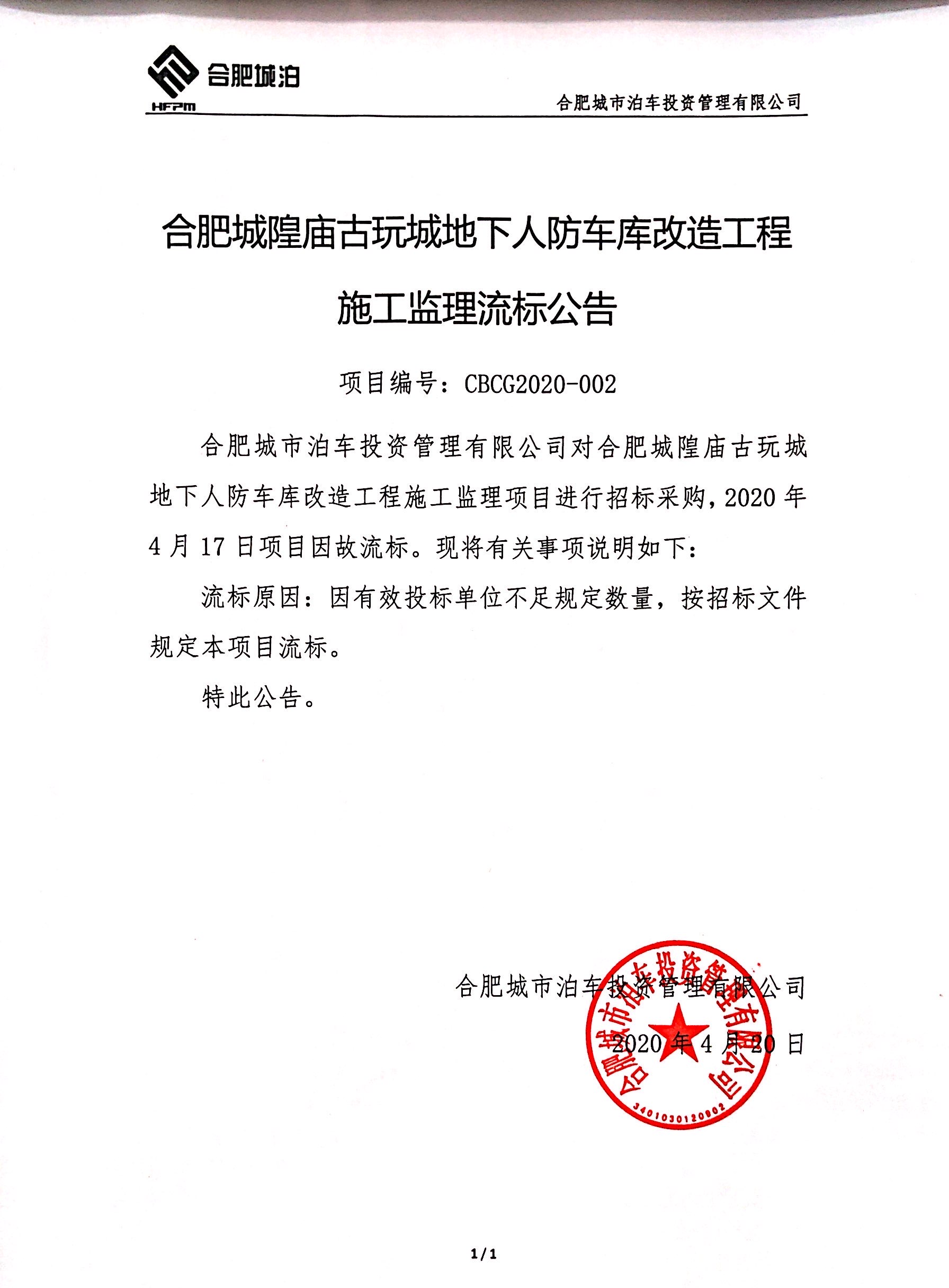 合肥城隍庙古玩城地下人防车库改造工程施工监理流标公告