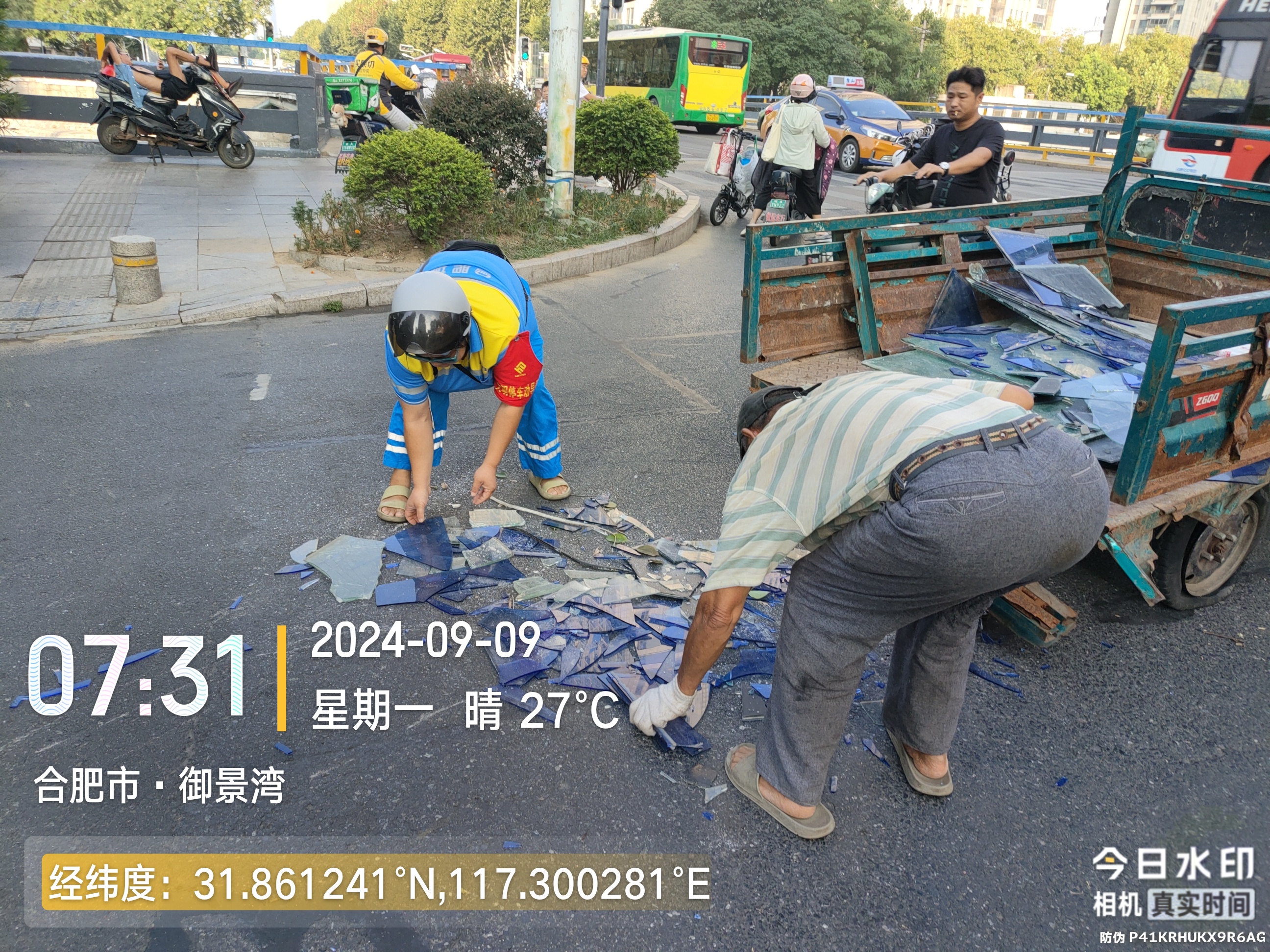 当天早7时,正是一个城市繁忙的时间。却不料一场小意外打破了道路的宁静。大爷的三轮车因年久失修,后挡板在行驶中突然脱落,伴随着刺耳的声响,一块块锋利的碎玻璃四散开来,铺满路面,过往行人不得不纷纷避让,生怕被碎片所伤。情况发生后,孙大姐,一位合肥城泊的泊管员,没有丝毫犹豫,毅然决然地走向了需要帮助的大爷。
