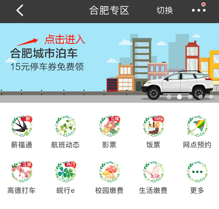 进入“合肥城市泊车,15元停车券免费领”活动,领取3张5元停车券。(每月限用一张)