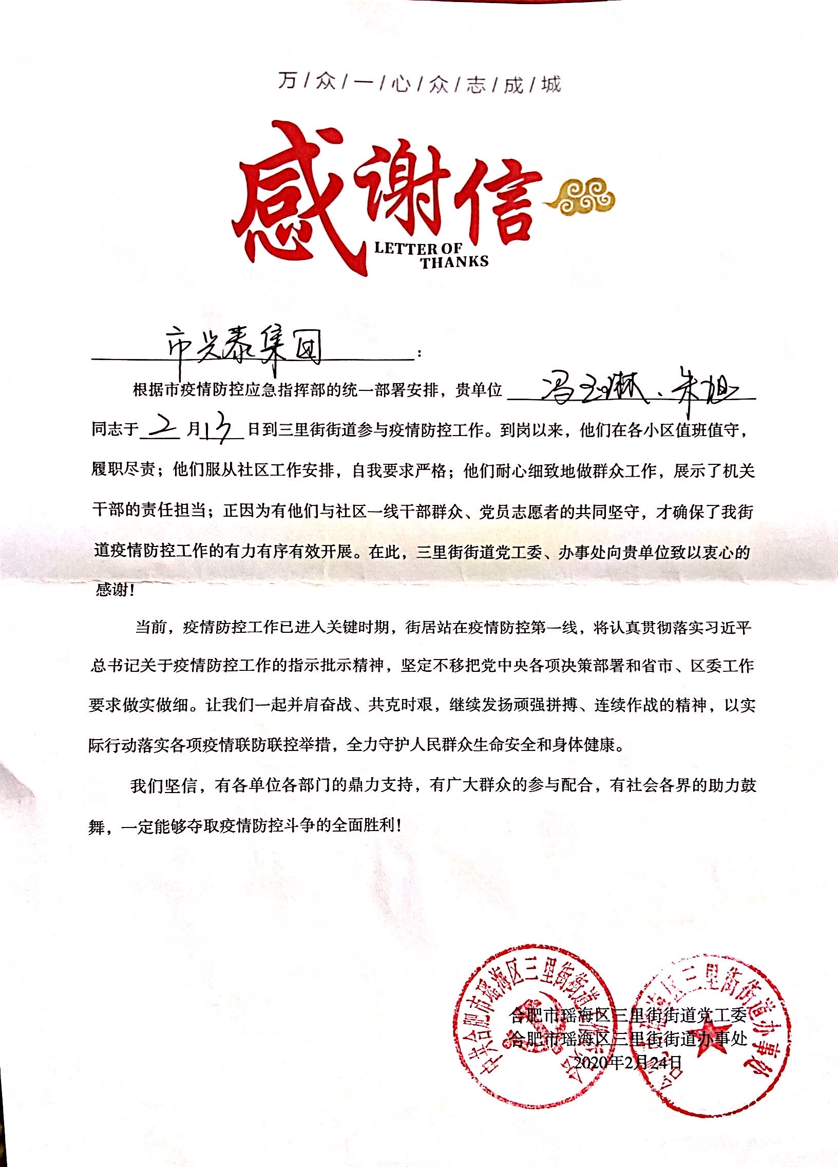 近日,支援防控一线的城泊员工冯玉琳收到了一份“特殊”的礼物——来自合肥市瑶海区三里街街道党工委、街道办事处发来的感谢信。信中说道:“到岗以来,他们在各小区值班值守,履职尽责;他们耐心细致地做群众工作,展示了机关干部的责任与担当… …”短短数百字的内容,却传递着沉甸甸的情谊,温暖了每一位防疫奋战中的城泊人。