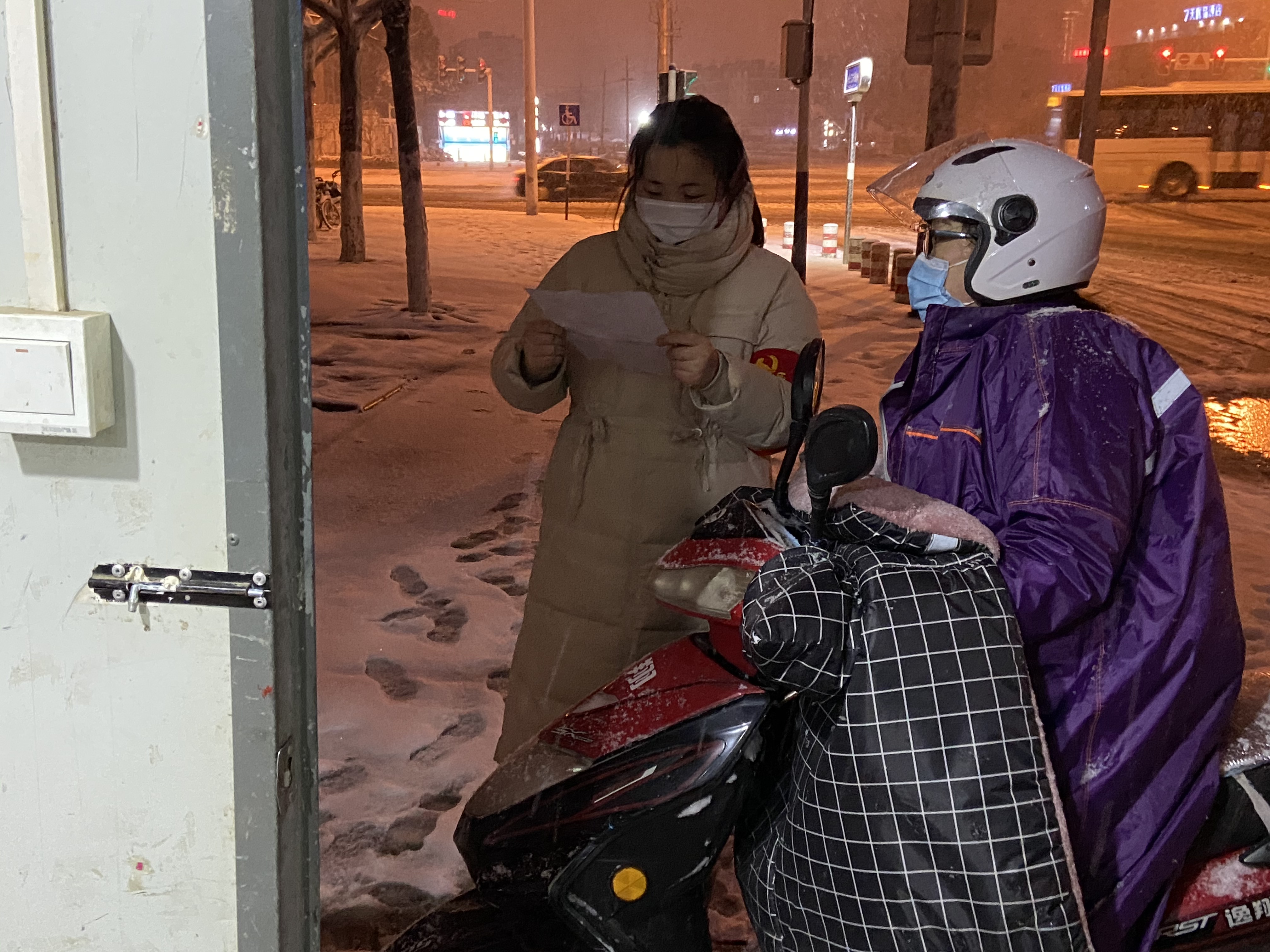 城泊员工冯玉琳所支援的社区是一个老旧小区,防疫难度大、任务重,由于这个小区志愿者均为娘子军,很多三无小区又需要24小时防守,于是她果断申请值夜班。戴上口罩、戴好红袖章,一守就是大半夜,为出入小区的居民测量体温并检查出入证。值守虽然辛苦,但周边居民的理解和配合让冯玉琳觉得“值得”。“2月15日大雪纷飞,寒风凛凛,当天夜里一位阿姨从外面回来,她看见我后立马下车配合测量体温,还对我说了句‘辛苦’,当时心里就暖暖的。看见阿姨没带伞,身上被风雪淋湿了,我立刻从包里取了一把伞。看着她远去的背影,我觉得一切都是值得的”。冯玉琳在自己的战“疫”日记中写道。