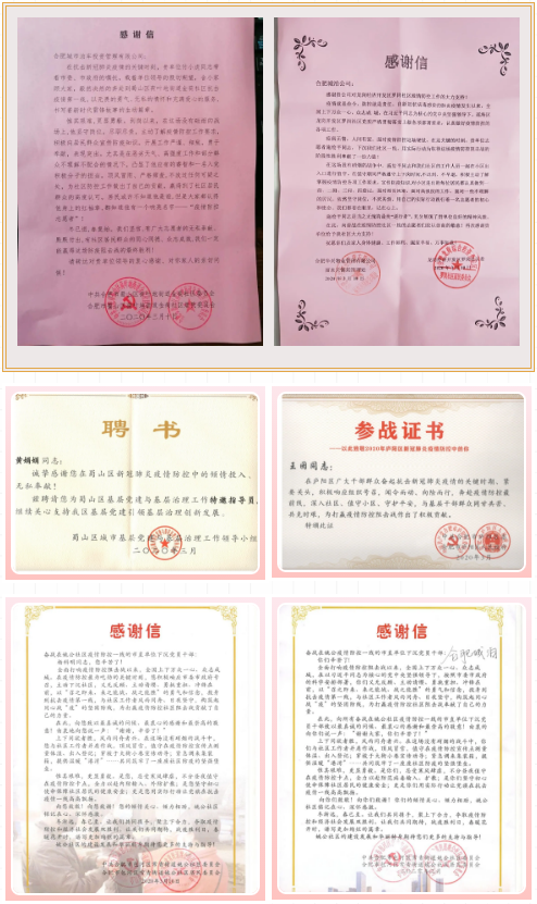 近期,合肥城泊下沉社区支援的同志们陆续收到了所值守的各个街道、社区为他们送来的感谢信。感谢他们在这场战“疫”中的辛勤付出和无私奉献,同时也为合肥城泊对基层防疫工作的大力支持表达诚挚的谢意。截至目前,合肥城泊收到的感谢信共计40余封。