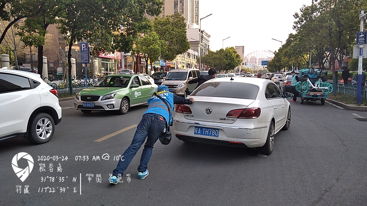 除了朱懂文以外,城泊泊管员沈颂栓的温暖举动也感动了在场的所有人。在3月24日上班早高峰期,经开区松谷路(翠微--芙蓉)东西两侧路段车流量大,一辆白色车突然熄火停在路中间无法启动,造成路面车辆拥堵,此时泊管员沈颂栓主动上前帮忙推车,在他的帮助下,路面交通秩序恢复正常。城泊泊管员沈颂栓的这一暖心举动,感动了所有人,在场的车主们纷纷给他点赞。