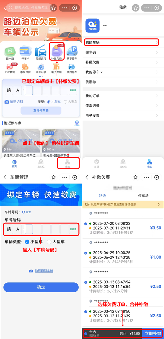 为避免上述影响,请您尽快通过“合肥停车”APP或“停宜慧”小程序完成欠费补缴,操作步骤参考如下: