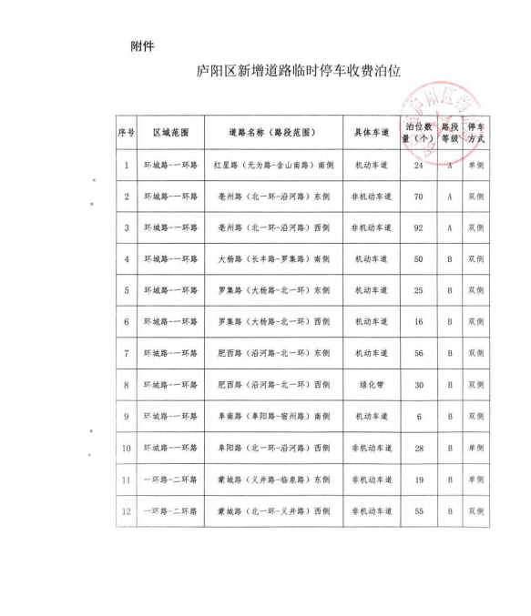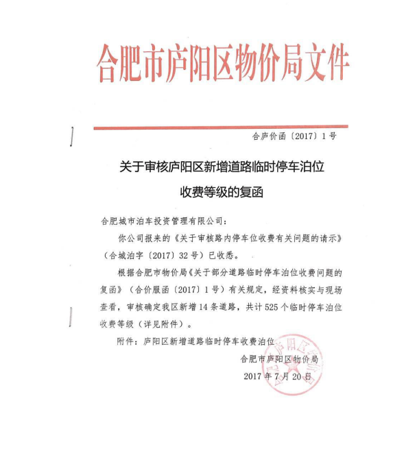 关于审核庐阳区新增道路临时停车泊位收费等级的复函 合庐价函[2017]1号