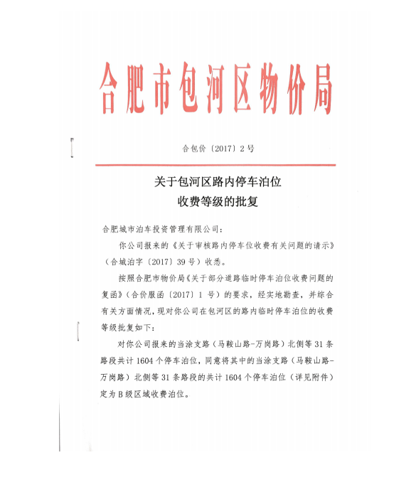 关于包河区路内停车泊位收费等级的批复 合包价[2017]2号