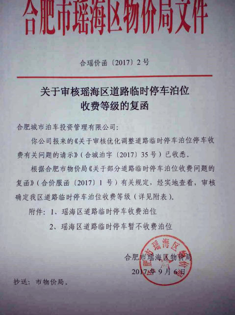 关于审核瑶海区道路临时停车泊位收费等级的复函 合瑶价函[2017]1号