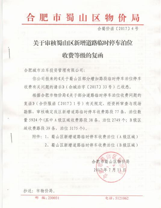 关于审核蜀山区新增道路临时停车泊位收费等级的复函 合蜀价函[2017]4号