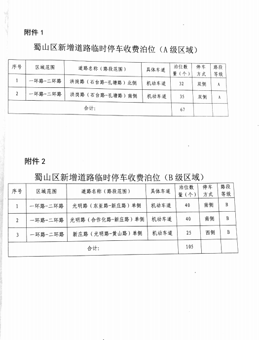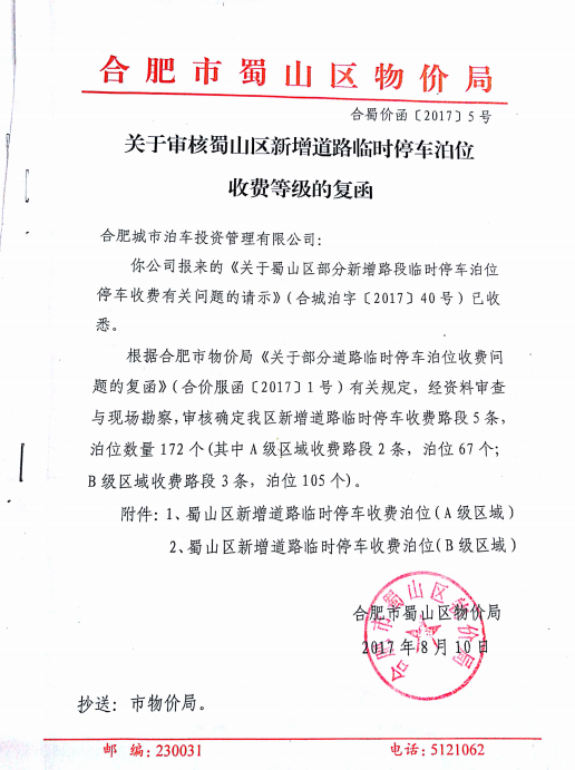 关于审核蜀山区新增道路临时停车泊位收费等级的复函 合蜀价函[2017]5号
