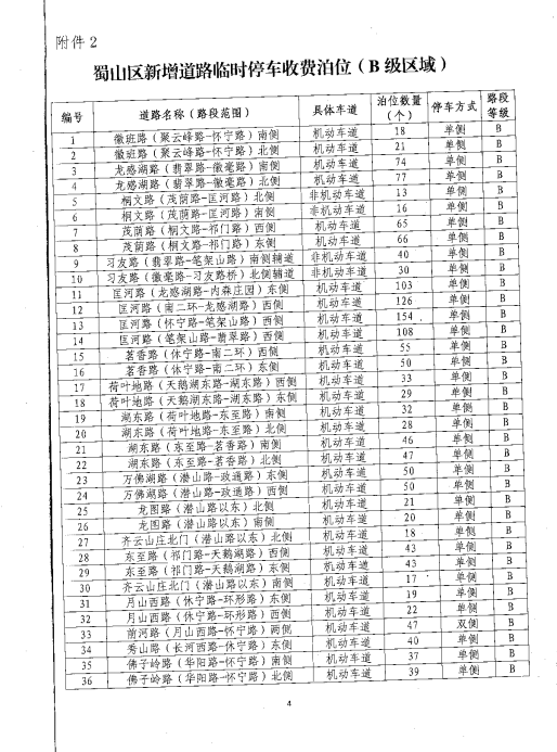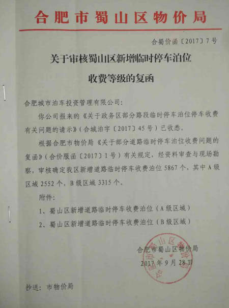 关于审核蜀山区新增道路临时停车泊位收费等级的复函 合蜀价函[2017]8号