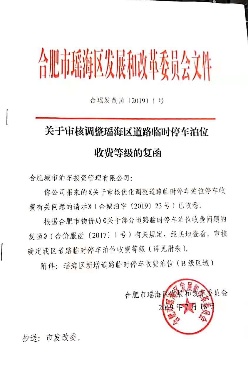 关于审核调整瑶海区道路临时停车泊位收费等级的复函