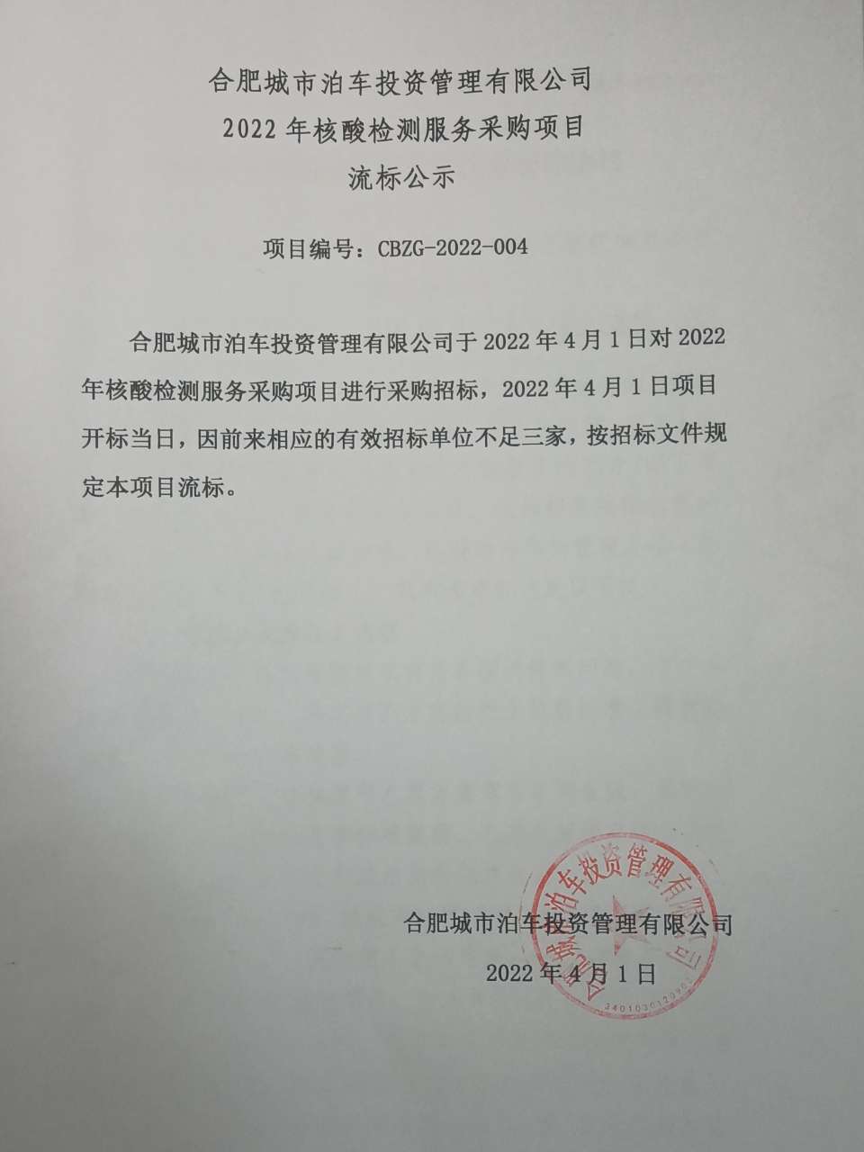 合肥城市泊车投资管理有限公司 2022年核酸检测服务采购项目流标公示