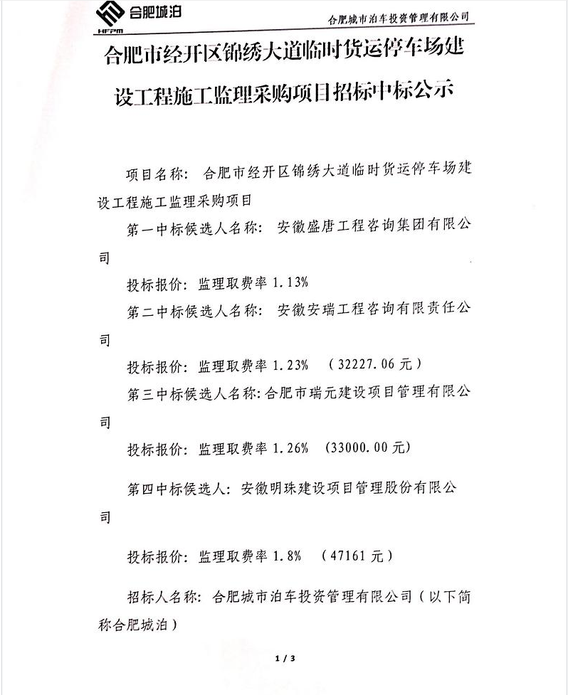 合肥市经开区锦绣大道临时货运停车场建设工程施工监理采购项目招标中标公示