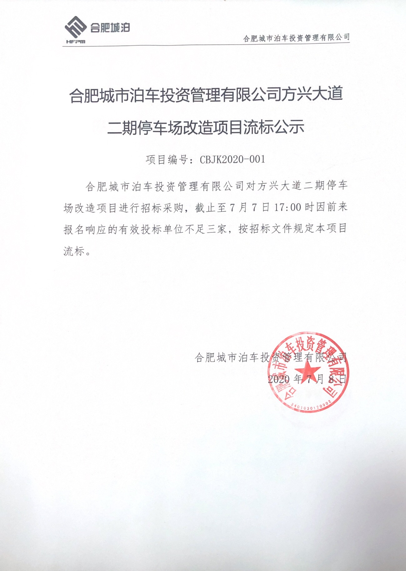 合肥城市泊车投资管理有限公司方兴大道二期停车场改造项目流标公示