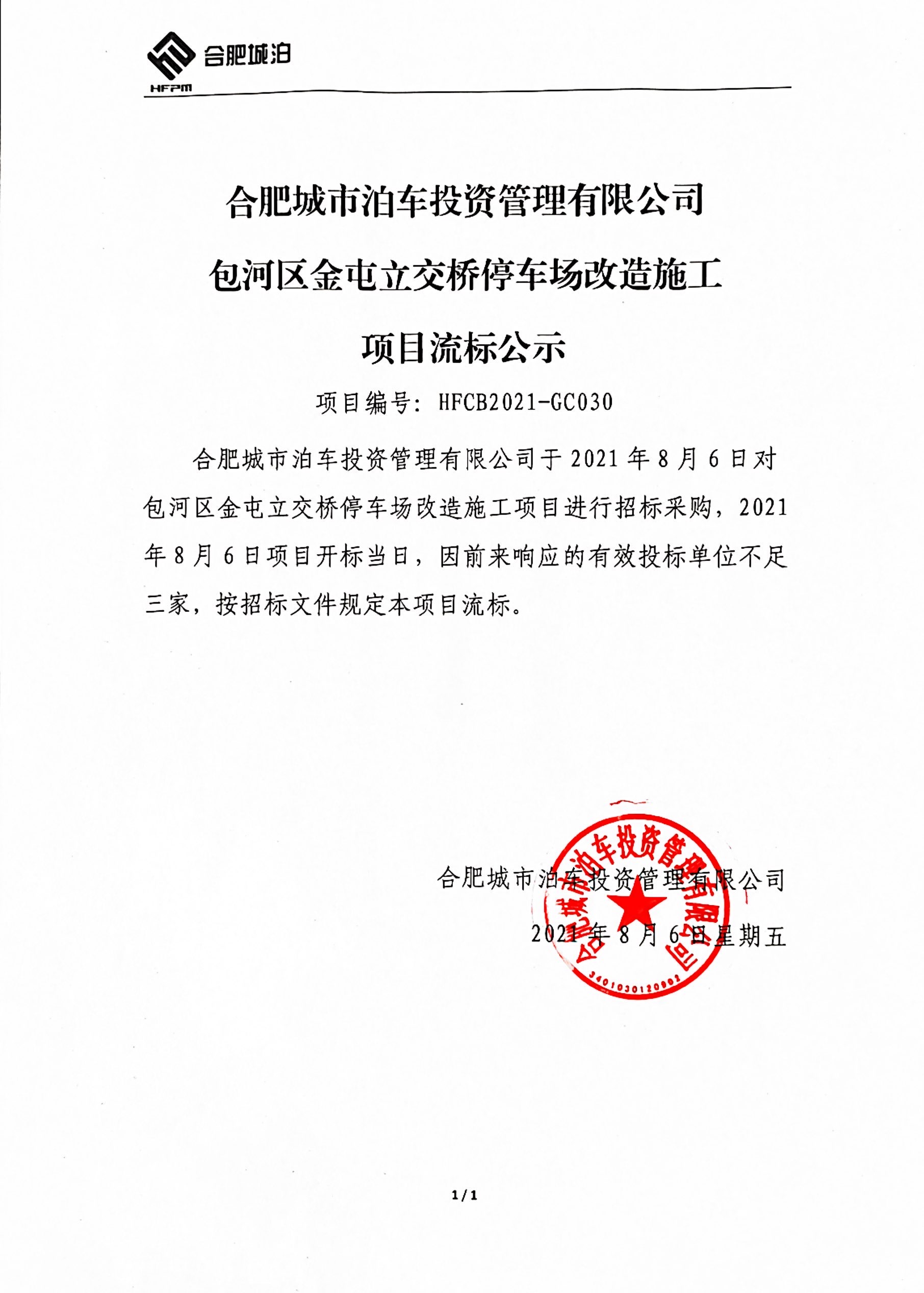 合肥城市泊车投资管理有限公司包河区金屯立交桥停车场改造施工项目流标公示